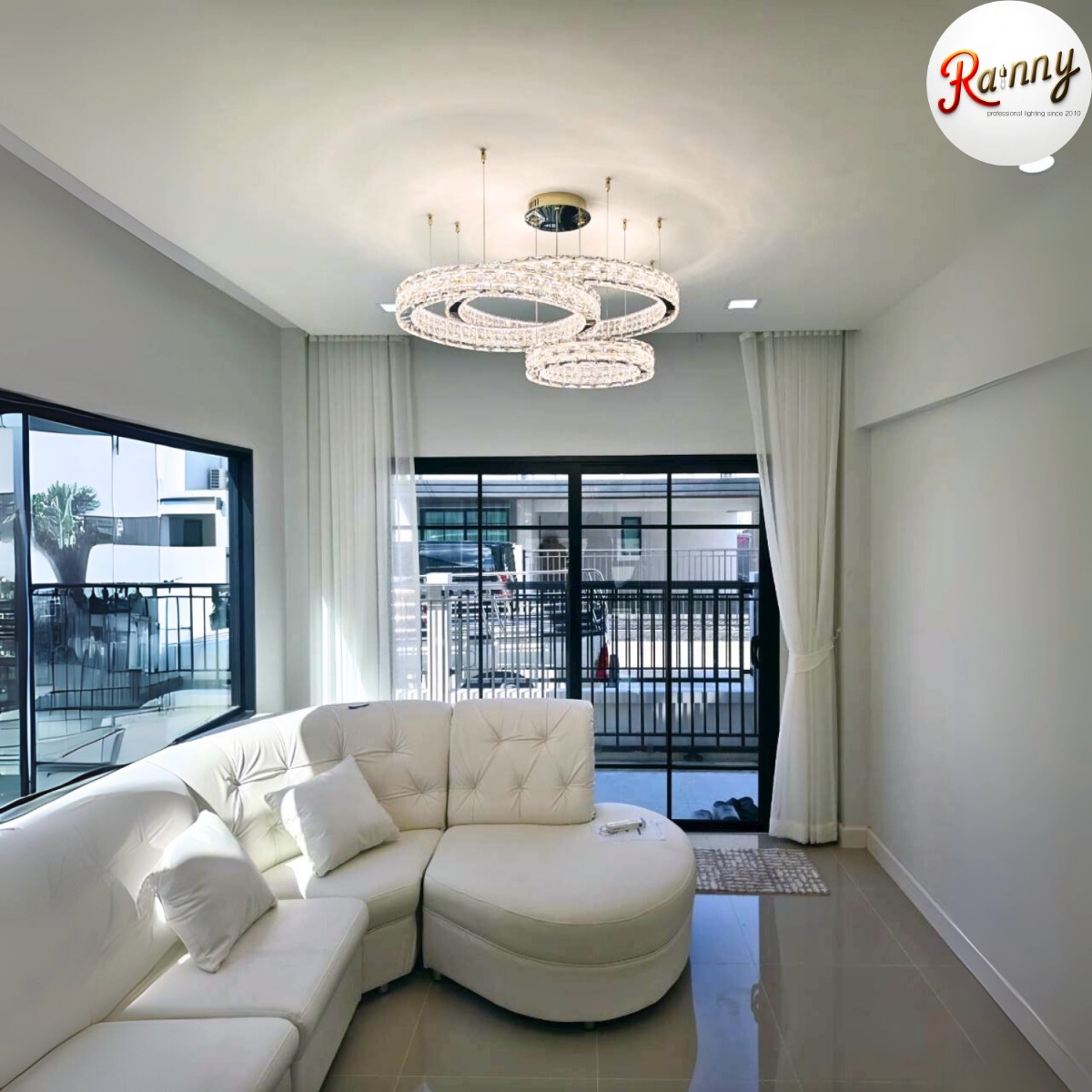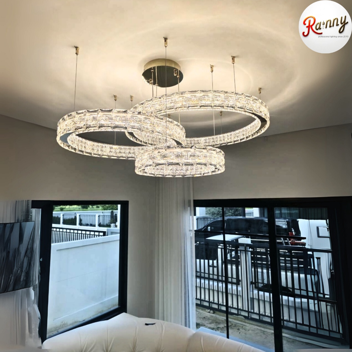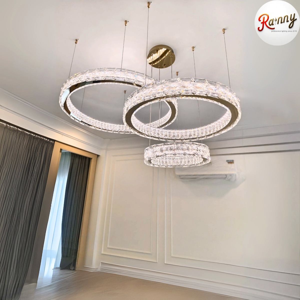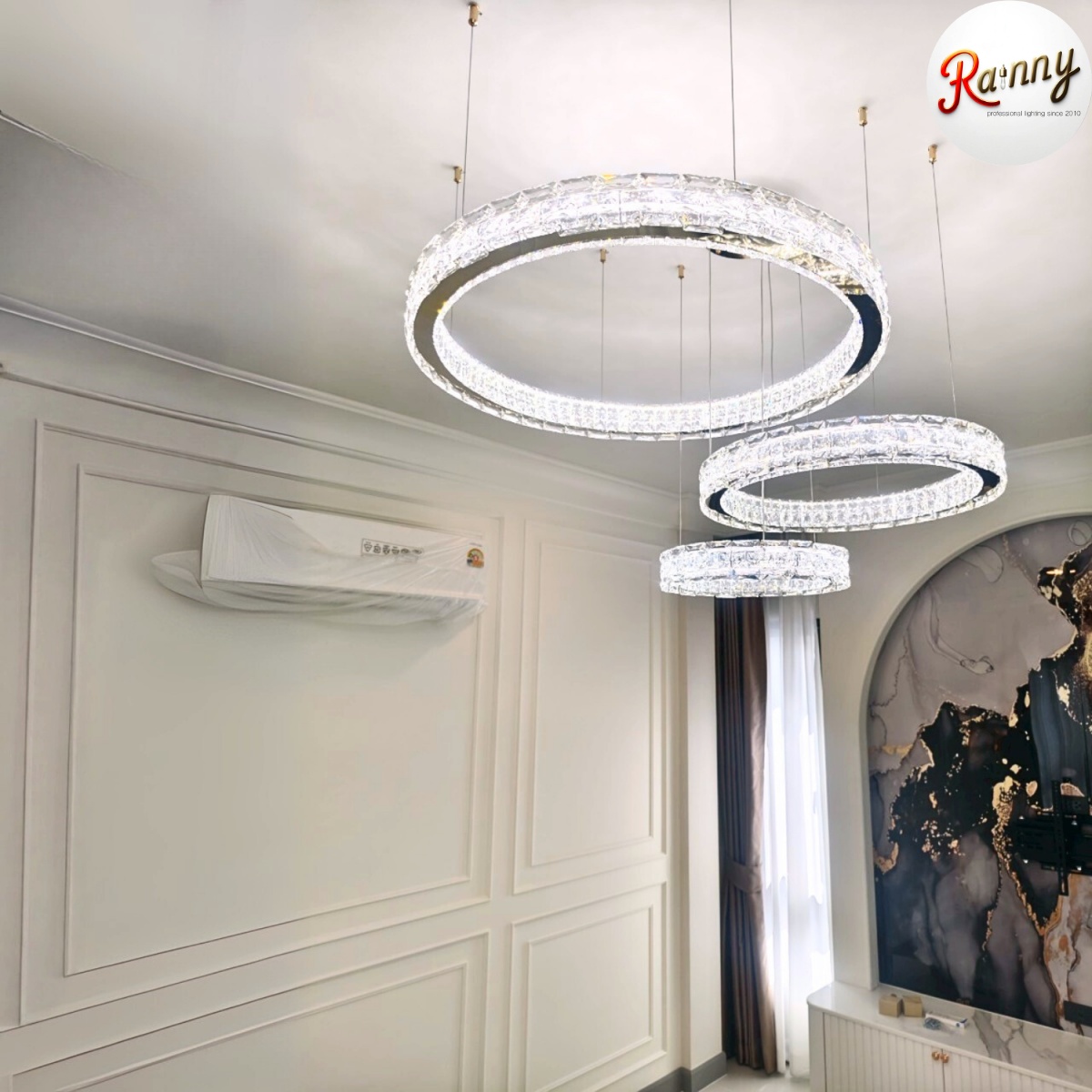 โคมไฟคริสตัล โมเดิร์น ประดับด้วยคริสตัลจัดเรียงเป็นวงแหวนเป็นชั้นๆ บนโครงสร้างแสตนเลสสตัล และยังปรับ Mood and Tone ของห้องได้ด้วยไฟ LEDs แสงอุ่น และแสงขาวใช้ตกแต่งห้องโถง ,ห้องรับแขก, โถงบันได หรือโต๊ะทานข้าว ให้อารมย์การแต่งห้องแบบเรียบ เท่ หรู ไม่เหมือนใคร ชุดสายสามารถ ปรับสั้น ยาว เพื่อแต่งให้เข้ากับความสูงของห้องได้อีกด้วย