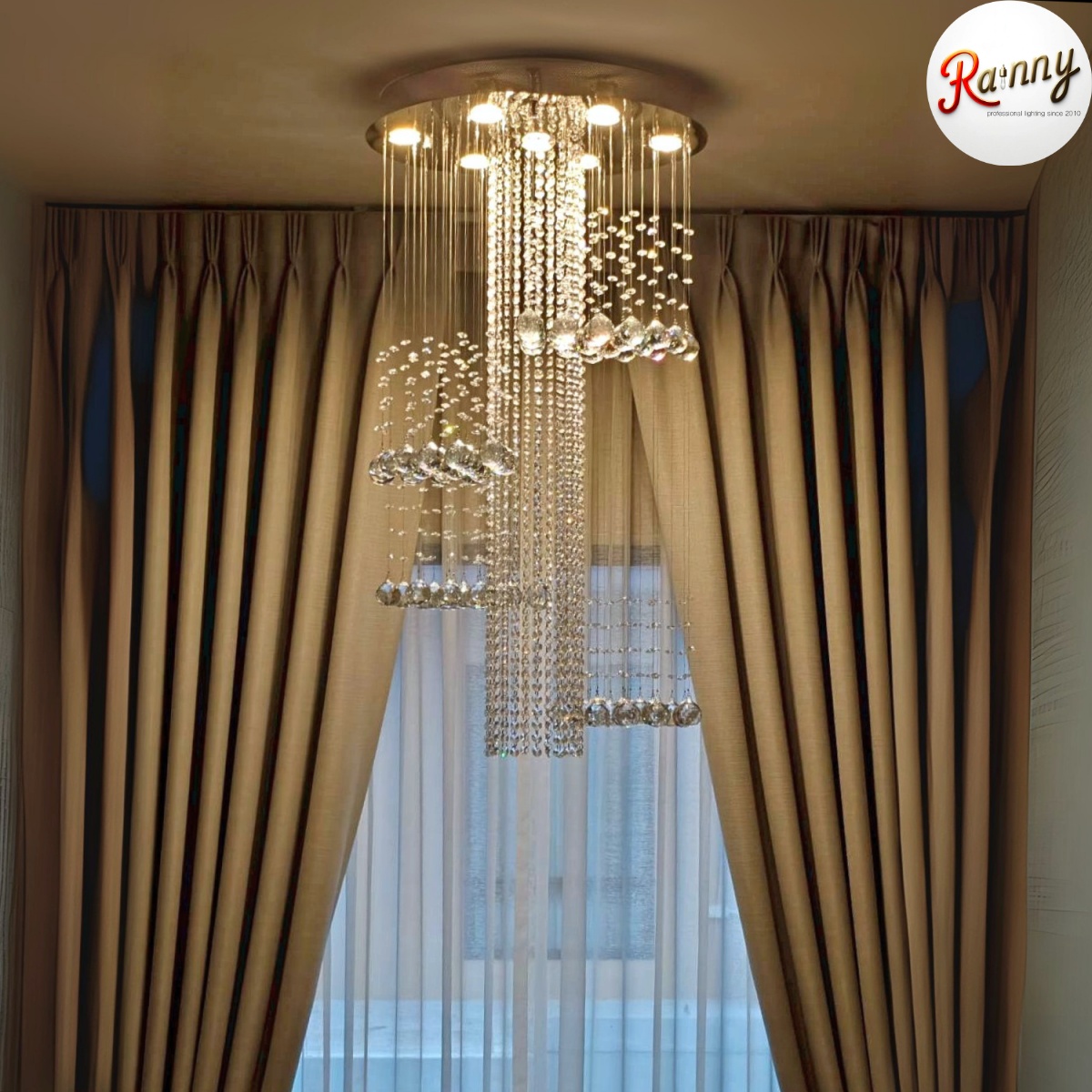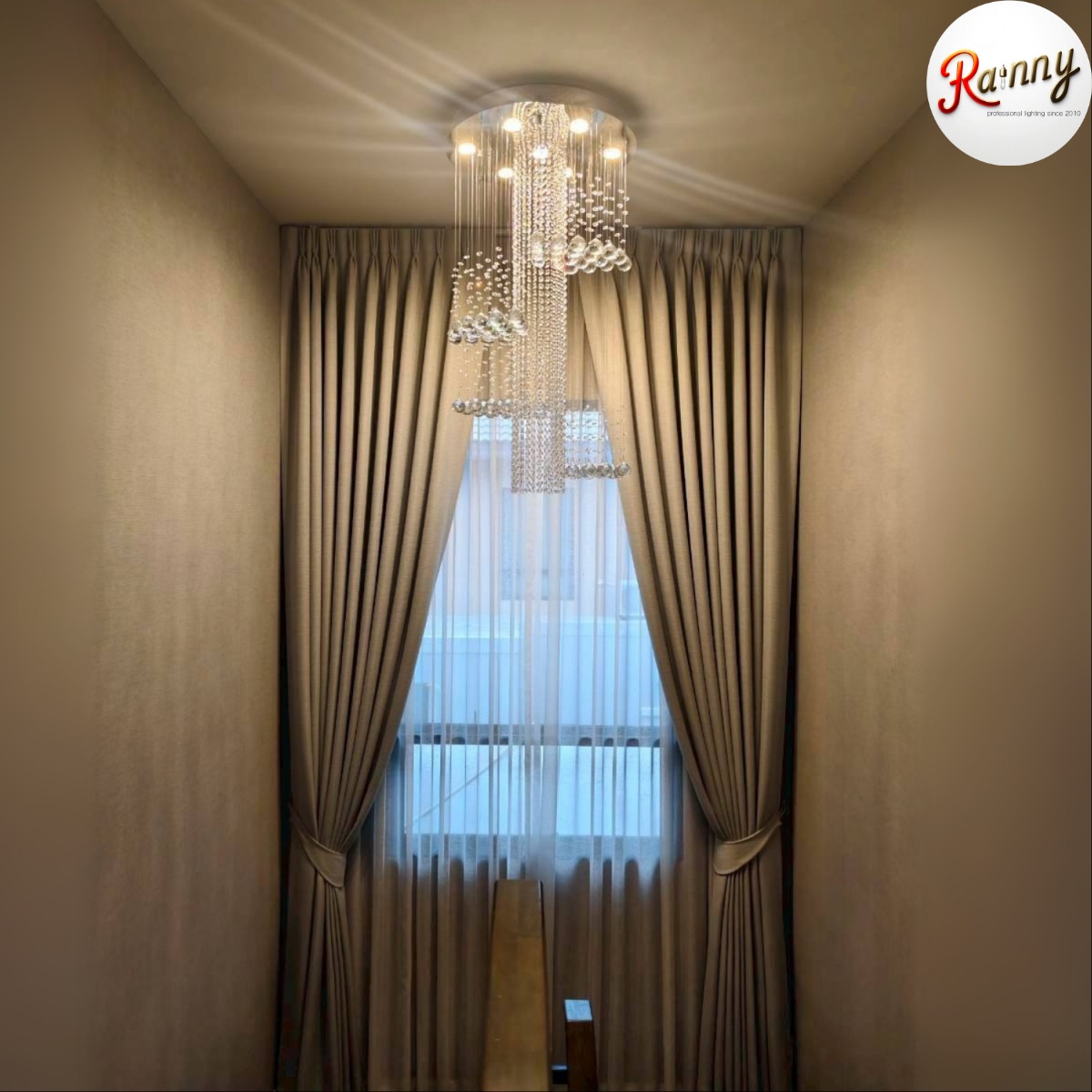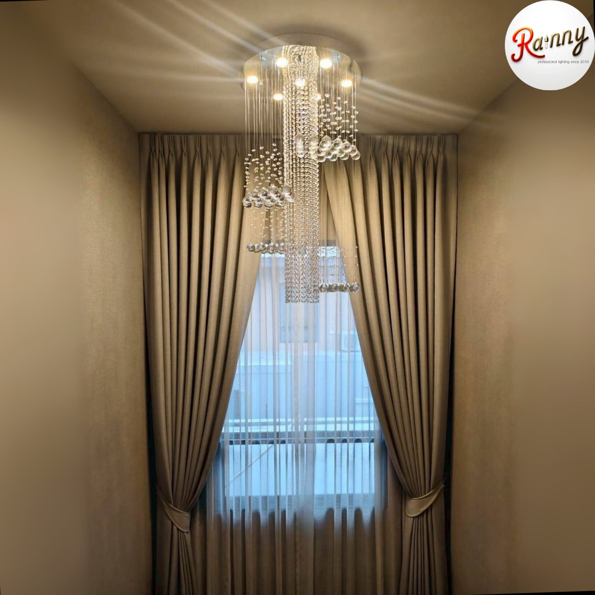 โคมไฟคริสตัล โมเดิร์น (Crystal Modern Lamp) แนวสลิง ออกแบบโดยใช้คริสตัลแท้คุณภาพสูง ร้อยเรียงเป็นรูปทรง ดูมีมิติ สวยงาม ร้อยเรียงด้วยแสตนเลสสลิงแท้ จึงแข็งแรง ไม่ยืดและไม่ขึ้นสนิม นิยมใช้บริเวณ ห้องโถง โถงบันได หรือร้านค้า โรงแรม ให้อารมย์การแต่งห้องแบบหรูหรามีระดับ
