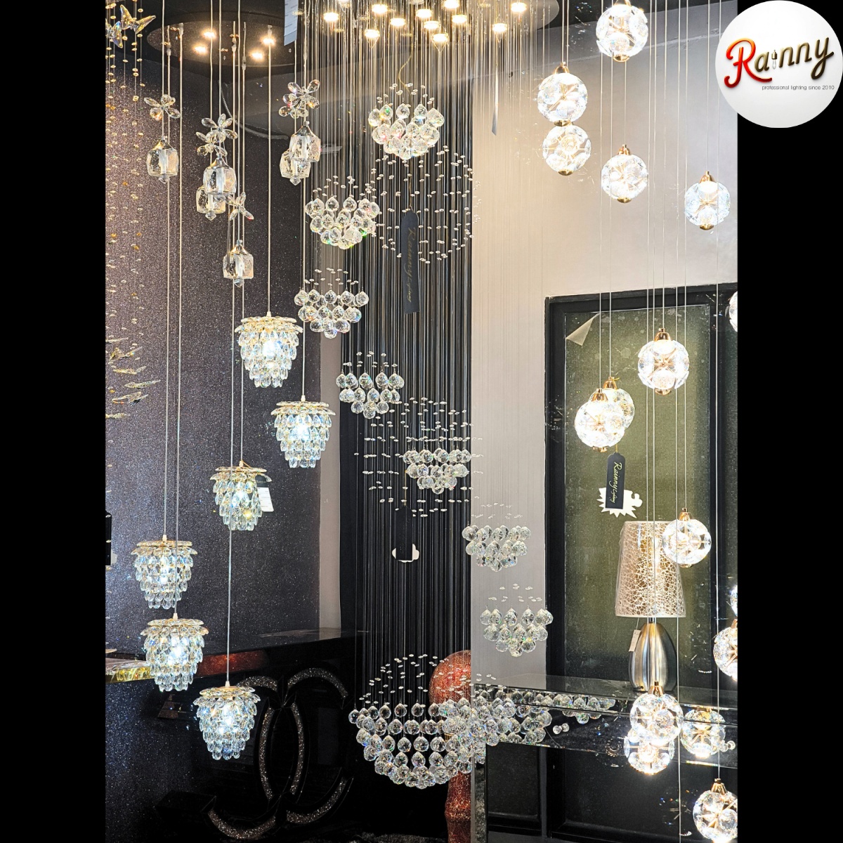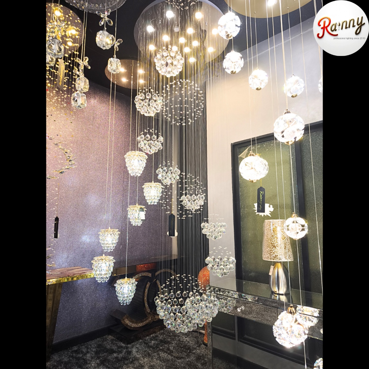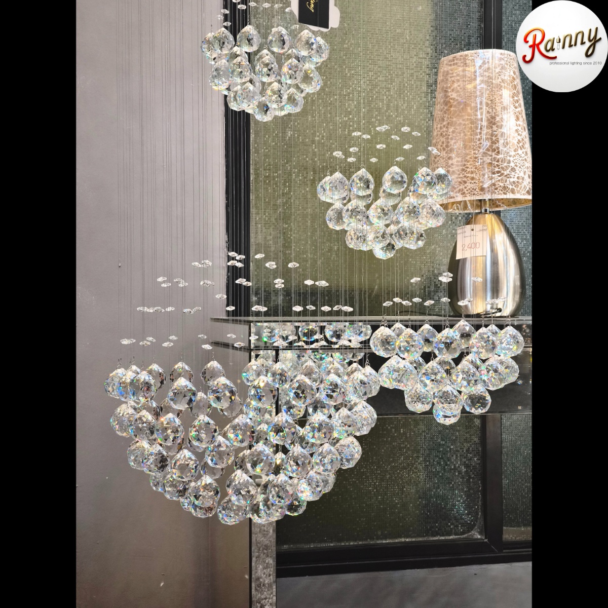 โคม ไฟคริสตัล โมเดิร์น (Crystal Modern Lamp) แนวสลิง ออกแบบโดยใช้คริสตัล ดูมีมิติ สวยงาม ร้อยเรียงด้วยแสตนเลสสลิงแท้ จึงแข็งแรง ไม่ยืดและไม่ขึ้นสนิม นิยมใช้บริเวณ ห้องโถง โถงบันได  หรือร้านค้า โรงแรม ให้อารมย์การแต่งห้องแบบหรูหรามีระดับ