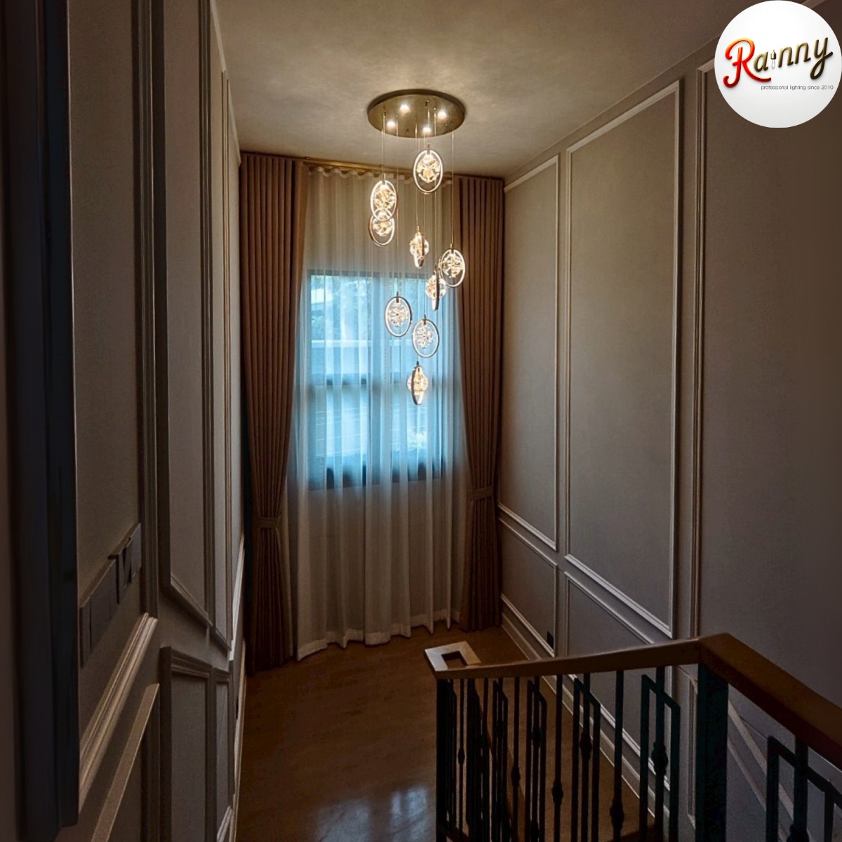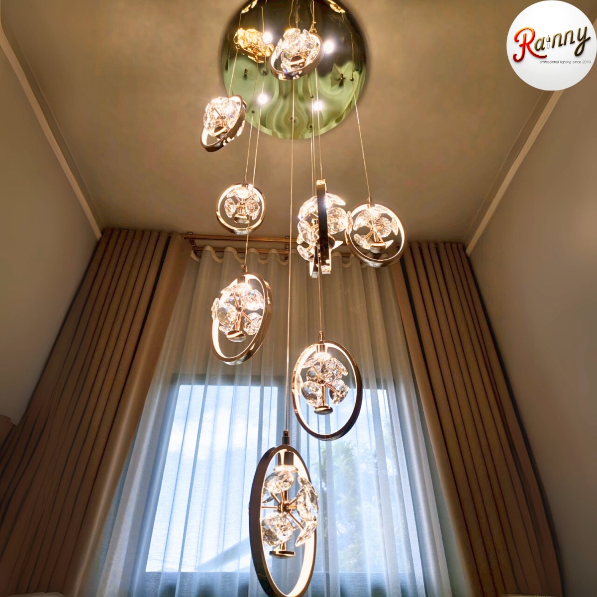 โคมไฟคริสตัล โมเดิร์น ประดับด้วยคริสตัลจัดเรียงเป็นพุ่มด้วยความปราณีต ทรงคล้ายลูกโอ๊ค 1 ชุดมี 6 ช่อ ใช้ตกแต่งห้องโถง หรือ โถงบันได เพื่อเพิ่มความหรูหรา และโดดเด่นด้วยดีไซน์ไม่เหมือนใคร
